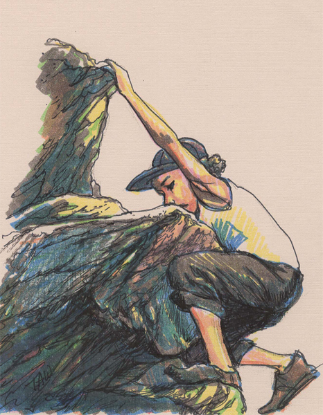This quick sketch of a climber clinging so tightly to the wall of rock that he could almost be a part of it is done with markers on pink paper. I’m always reaching for that next place in my artistic journey.